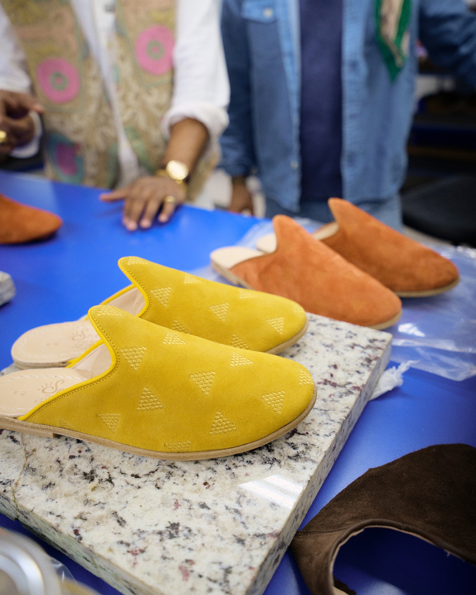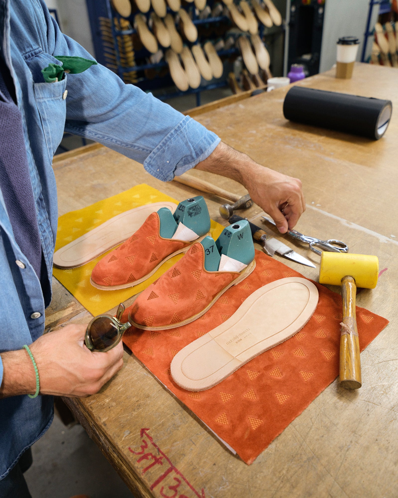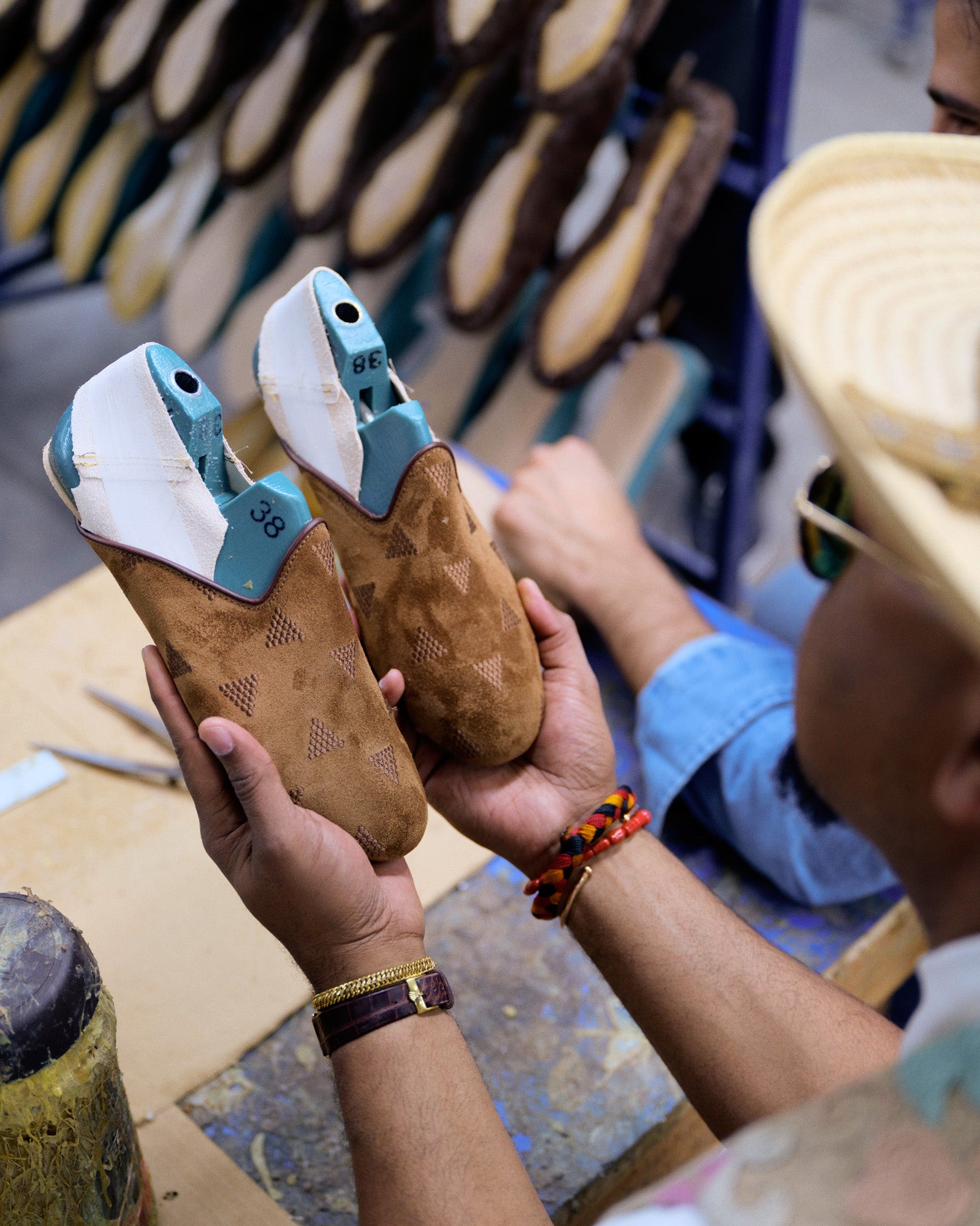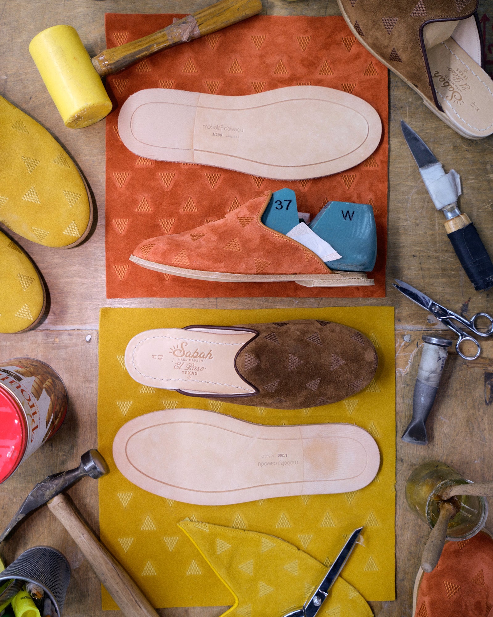 These Babas are handmade in El Paso, Texas from 100% Italian Suede uppers, then finely embroidered locally in El Paso. A small dot pattern reveals itself into a larger motif of triangles -- taking direct inspiration from several pieces in Mobolaji's own apparel collection.
