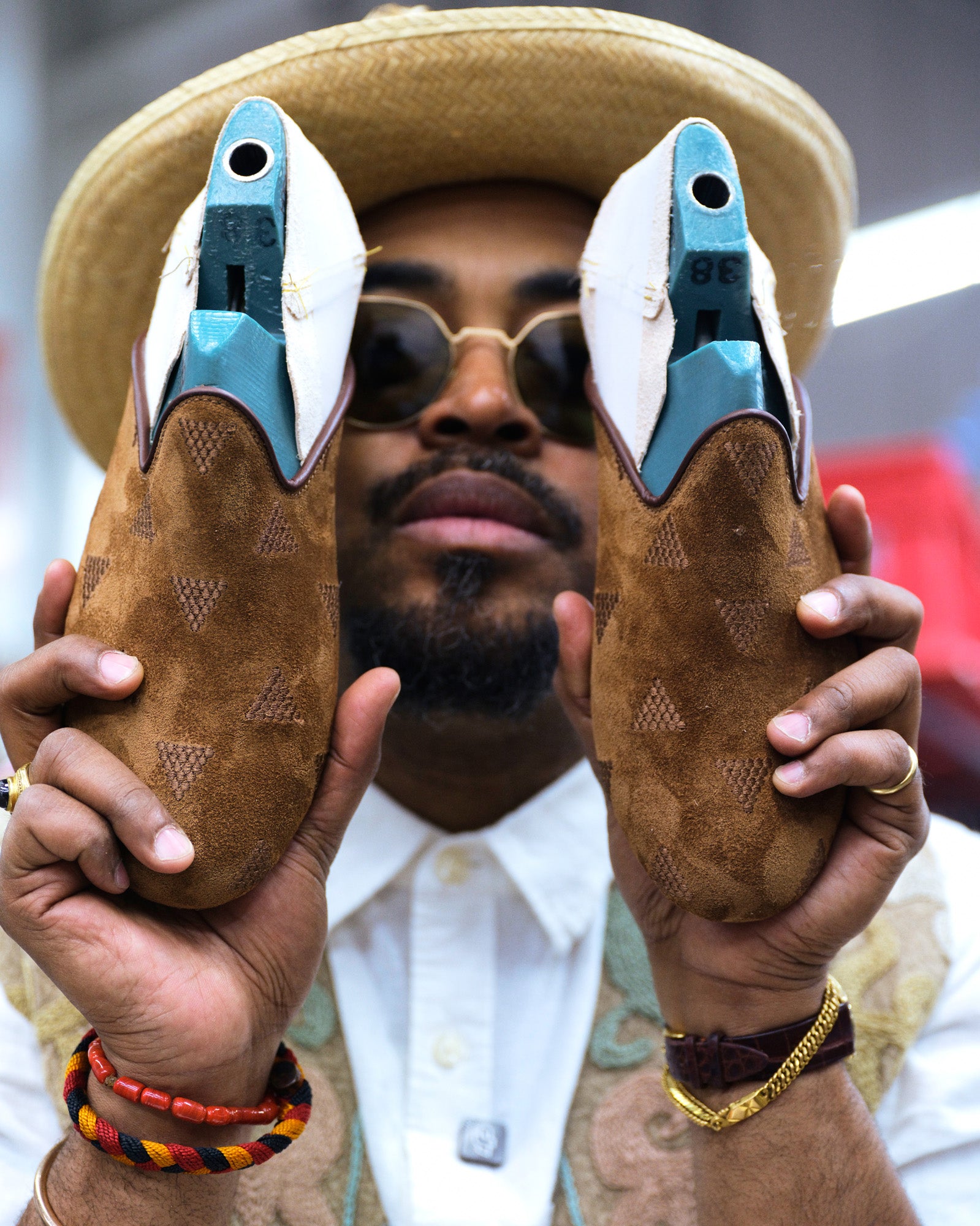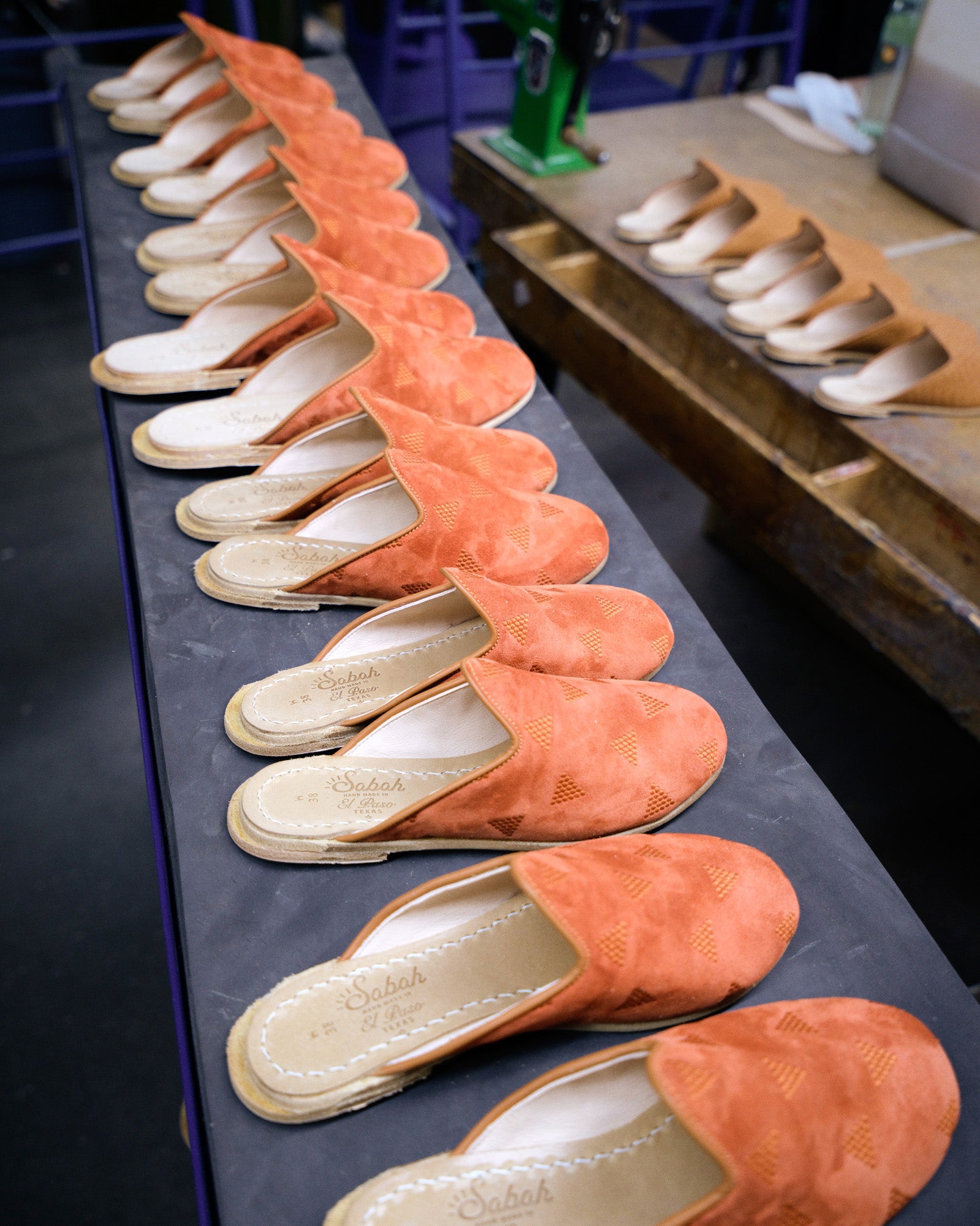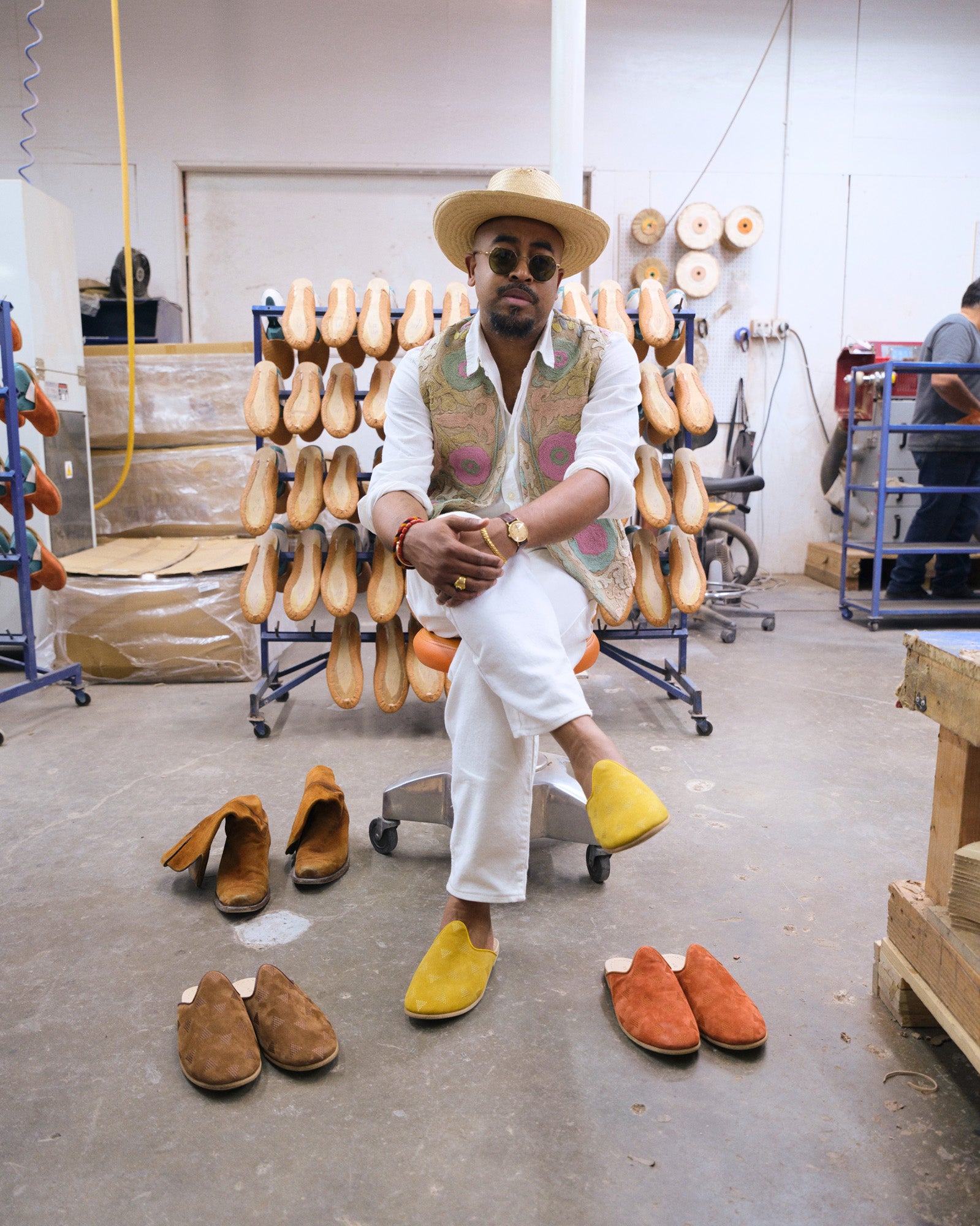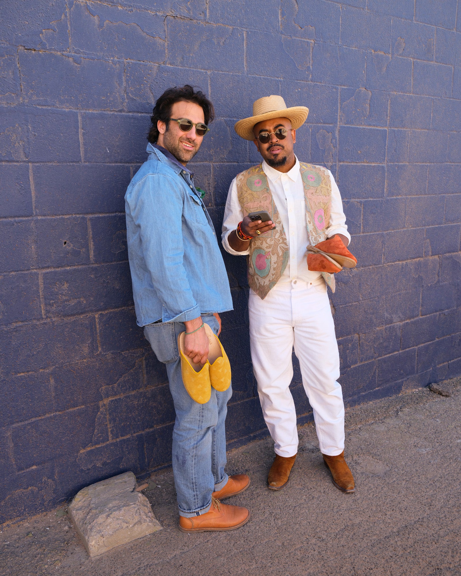 These Babas are handmade in El Paso, Texas from 100% Italian Suede uppers, then finely embroidered locally in El Paso. A small dot pattern reveals itself into a larger motif of triangles -- taking direct inspiration from several pieces in Mobolaji's own apparel collection.